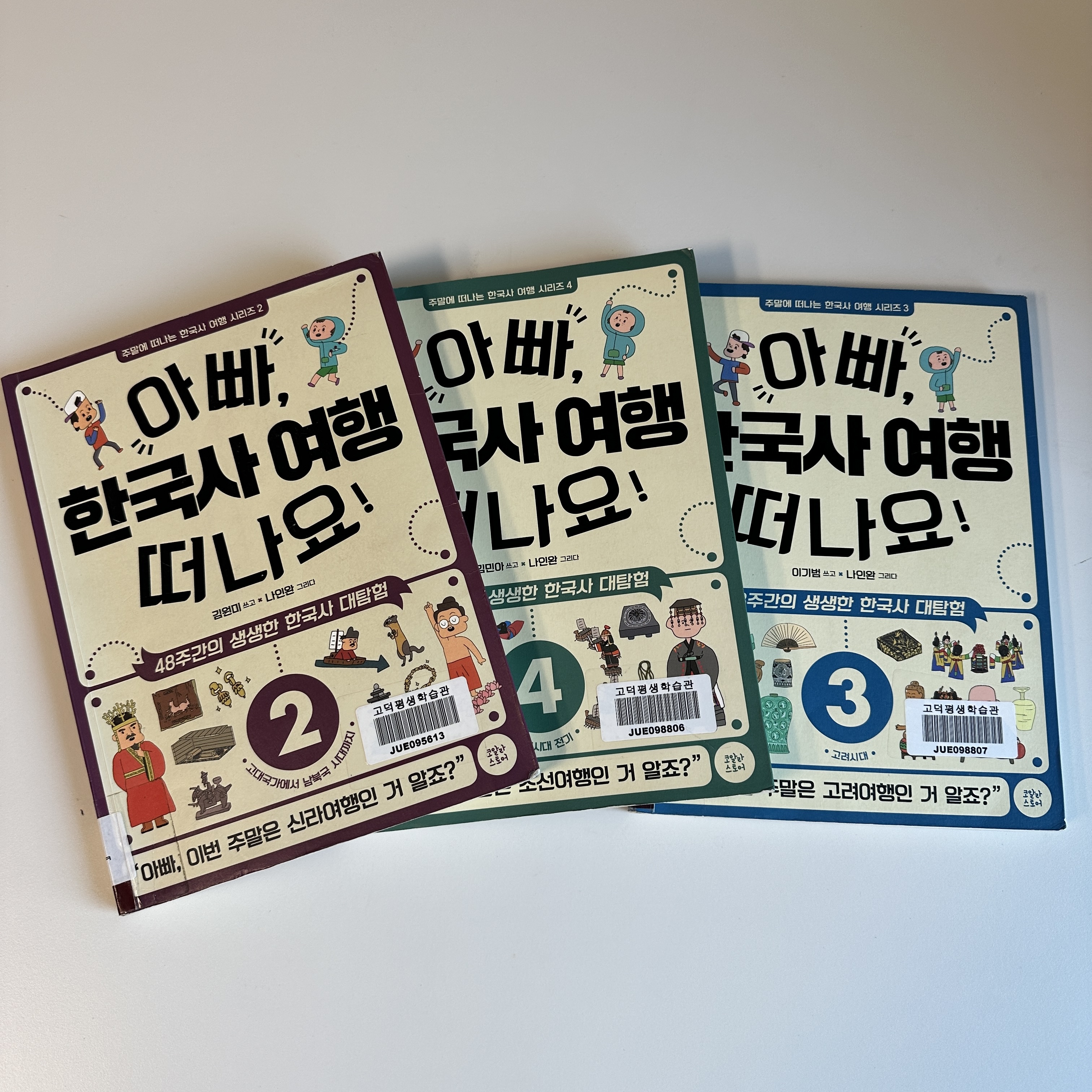이번 여름 <삼부자 역사기행>을 준비하며 가장 먼저 빌린 책. 제한된 시간 동안 무작정 여행할 수는 없고 콘텐츠는 많지만 양질의 정보를 얻는 데는 한계가 있는 만큼, 도서관을 열심히 뒤지던 끝에 발견한 <아빠, 한국사 여행 떠나요!> 시리즈. 전체 6권으로 구성되어 있는 이 시리즈는 어른인 부모가 먼저 탐독하기도 좋고, 아이들에게 설명하기도 편하다.