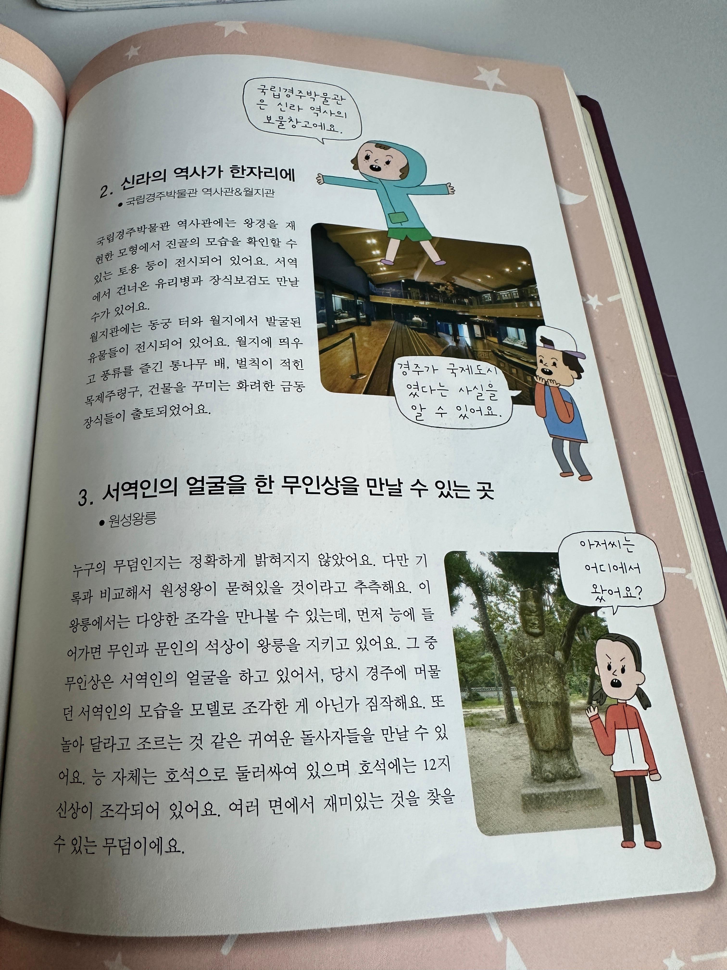 책에 등장하는 장소들은 실제로 방문 가능한 역사 유적지로 구성되어 있다. 예를 들어 경주, 공주, 서울의 고궁 등 다양한 지역의 역사 현장을 배경으로 하고 있다. 책을 다 읽은 후 가족이 함께 해당 장소를 여행하면 학습 효과가 더욱 커질 수 있을 듯하다. 내가 이 책을 고른 가장 큰 이유이기도 한점.