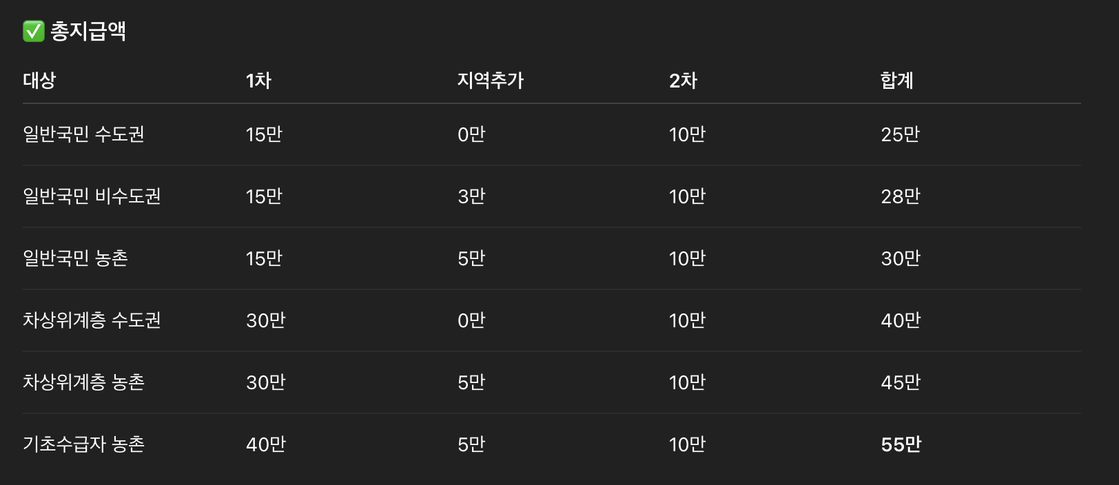 • 기본 금액: 일반 국민 1인당 15만 원.