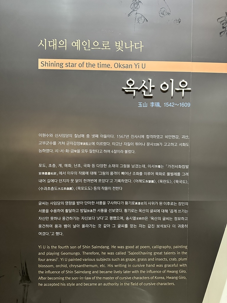 율곡이 태어난 에피소드나 신사임당의 자라났던 이야기와 둘의 재능에 얽힌 이야기들도 의미 있지만 개인적으로는, 딸인 이매창이나 막내아들 이우의 스토리가 좋았다. 어찌 보면 일가족이 학자이자 예술가의 집안이었던 그들의 실력과 노력에 감탄하게 되었기도 하지만, 조상들의 가르침과 유물을 잘 보존해 온 후손들 역시 대단하다는 생각이 들었다.