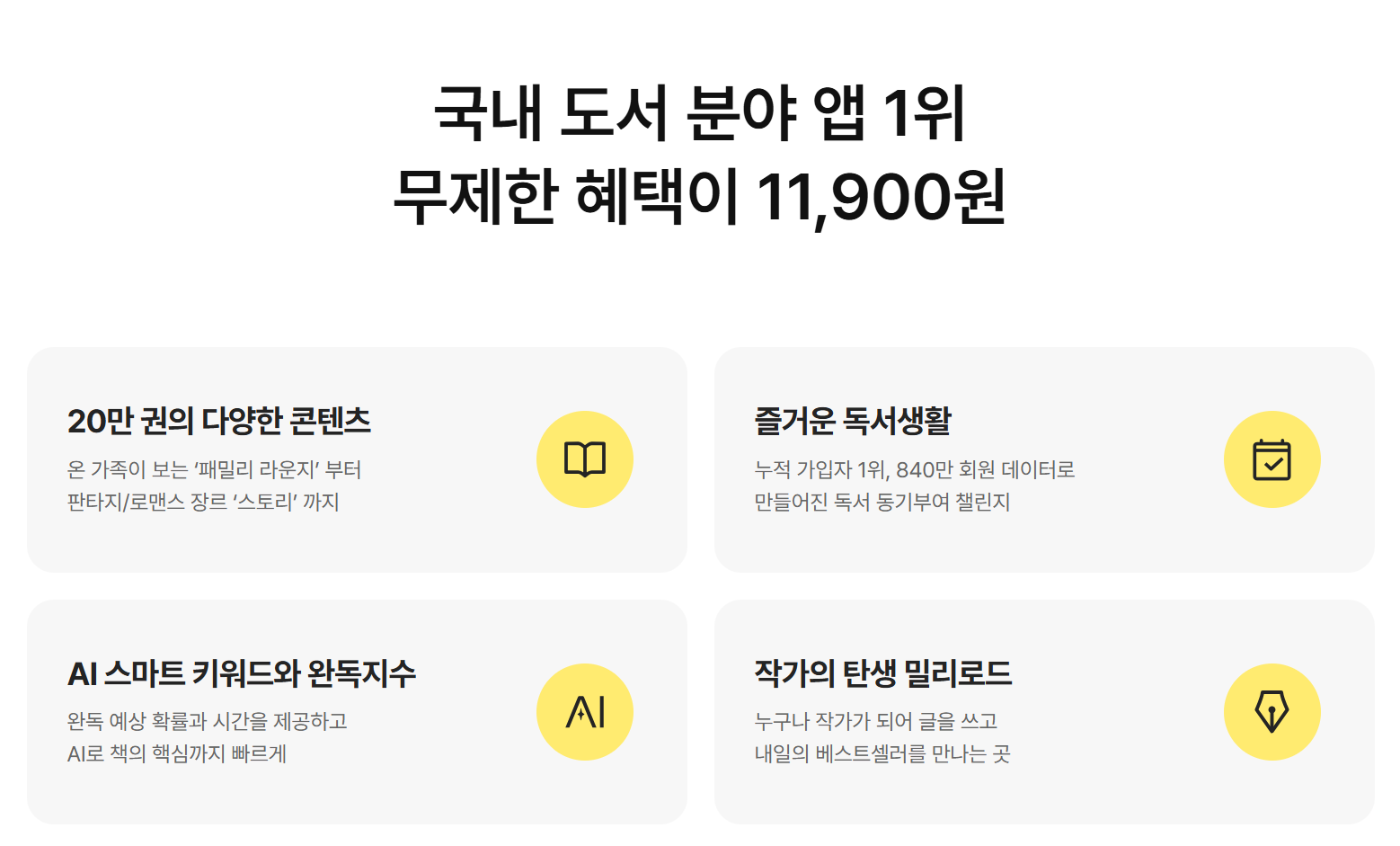 - 제휴사 프로모션: YES24, 알라딘, 인터파크 등 도서 플랫폼과 연계해 구독 할인권을 증정하는 이벤트가 진행된다.