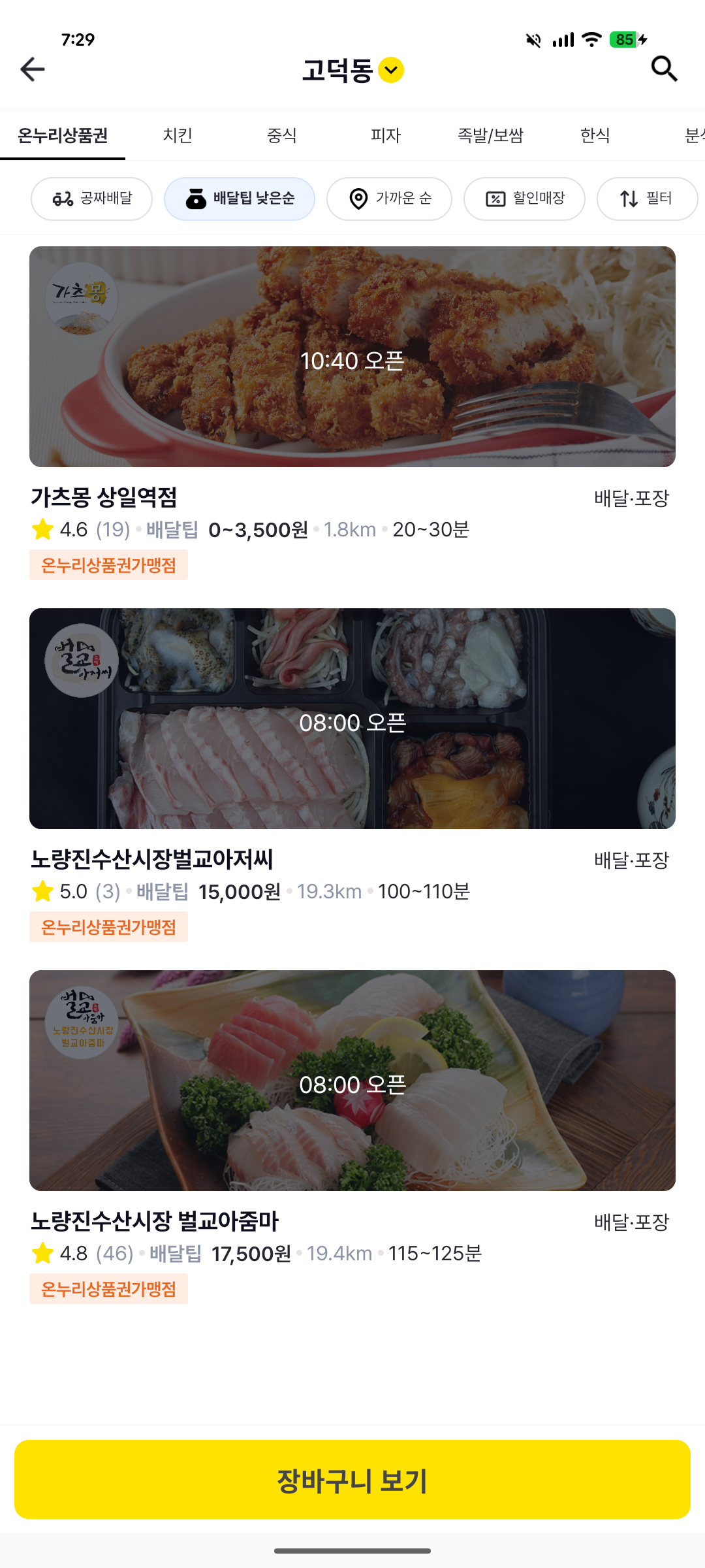 1. 주문할 가게 및 메뉴 선택: 먹깨비 앱에서 온누리상품권 가맹점을 확인한 후, 원하는 메뉴를 장바구니에 담는다.