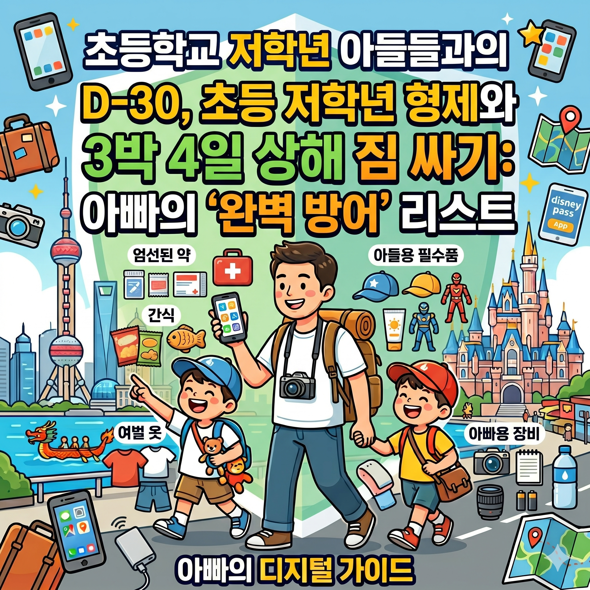 5월 말 상해 여행이 이제 딱 한 달 남짓 남았다. 3박 4일이라는 짧은 일정이지만, 초등학교 저학년 형제와 함께하는 해외여행은 짐 싸기 단계부터 '전략적 기획'이 필요하다. 짐을 줄이면서도 현장에서 당황하지 않기 위해 아빠의 시선에서 정리한 상해 여행 D-30 필수 체크리스트를 공유한다.